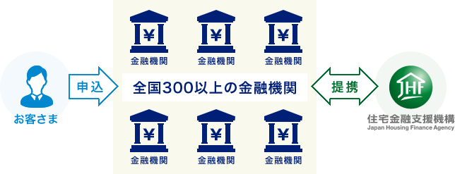 - 住宅金融支援機構と提携している全国で約300以上の金融機関(代理店)を通じて申し込みが可能です。